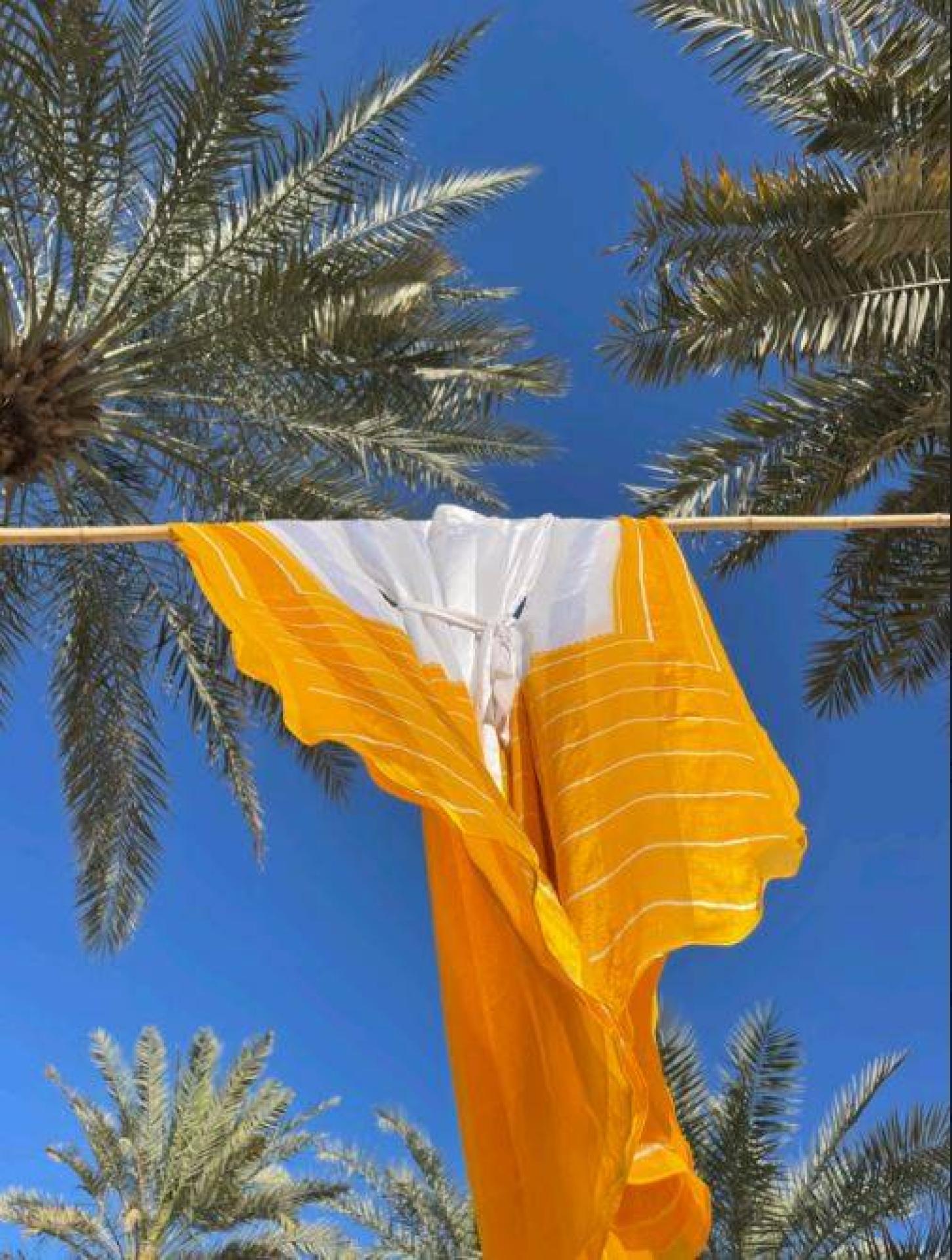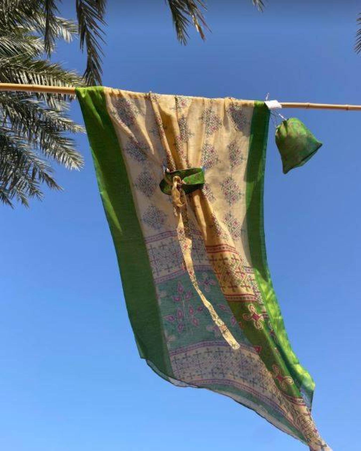 Chaque robe est unique, les sarees sont glanés au cours des voyages, ils se différencies par leur composition, souvent un mélange de soie et de polyester, puis cousus main au Qatar, avec les artisans locaux.